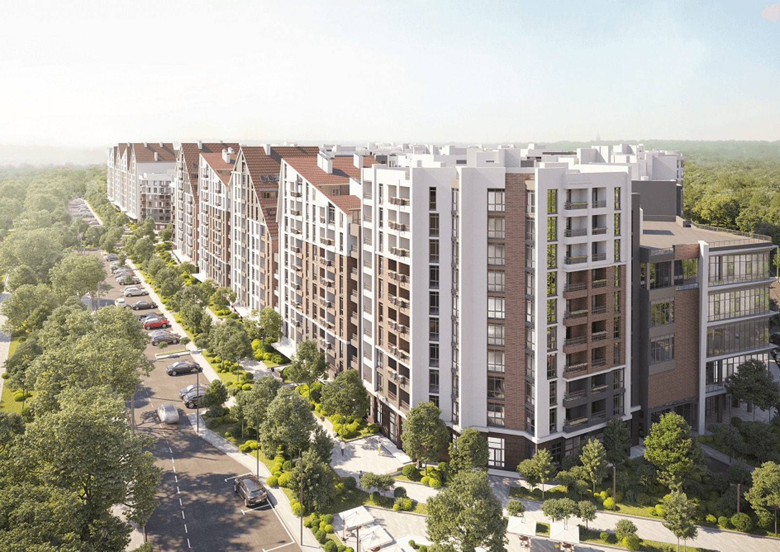 Масштабний житловий проєкт з великою кількістю зелених зон, орієнтований на сімейний формат проживання.